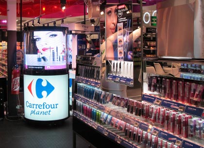 valorisant publicités, bandes annonces, clips vidéos et tout autre contenu numérique sur un écran circulaire.
